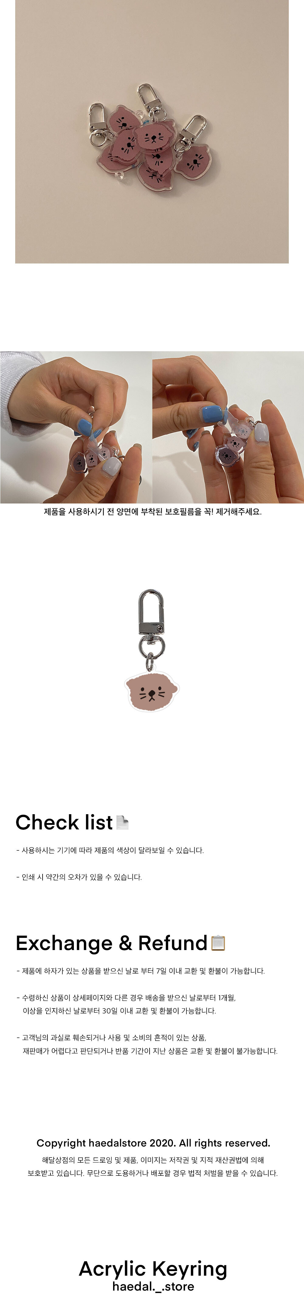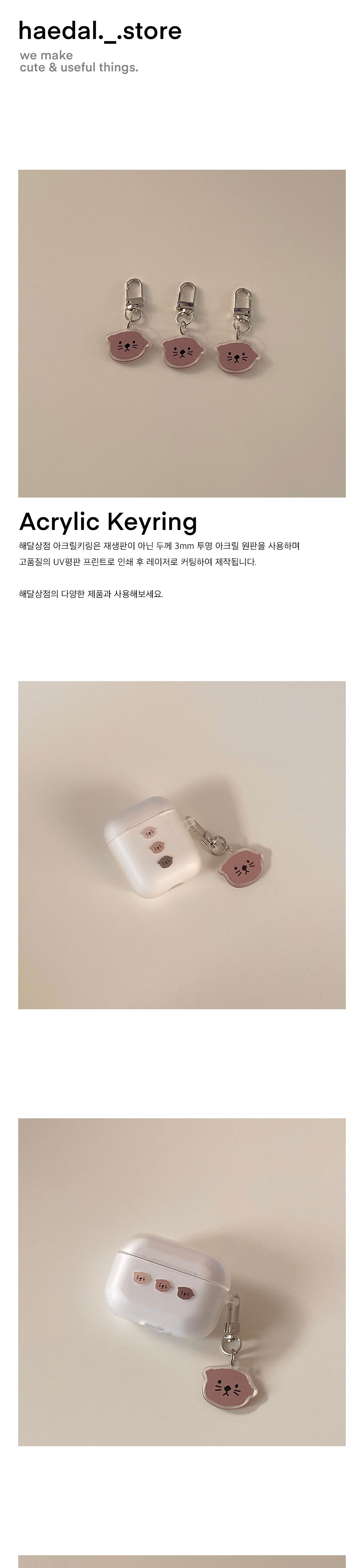해달상점 아크릴키링은 재생판이 아닌 두께 3mm 투명 아크릴 원판을 사용하며 고품질의 UV평판 프린트로 인쇄 후 레이저로 커팅 하여 제작됩니다.